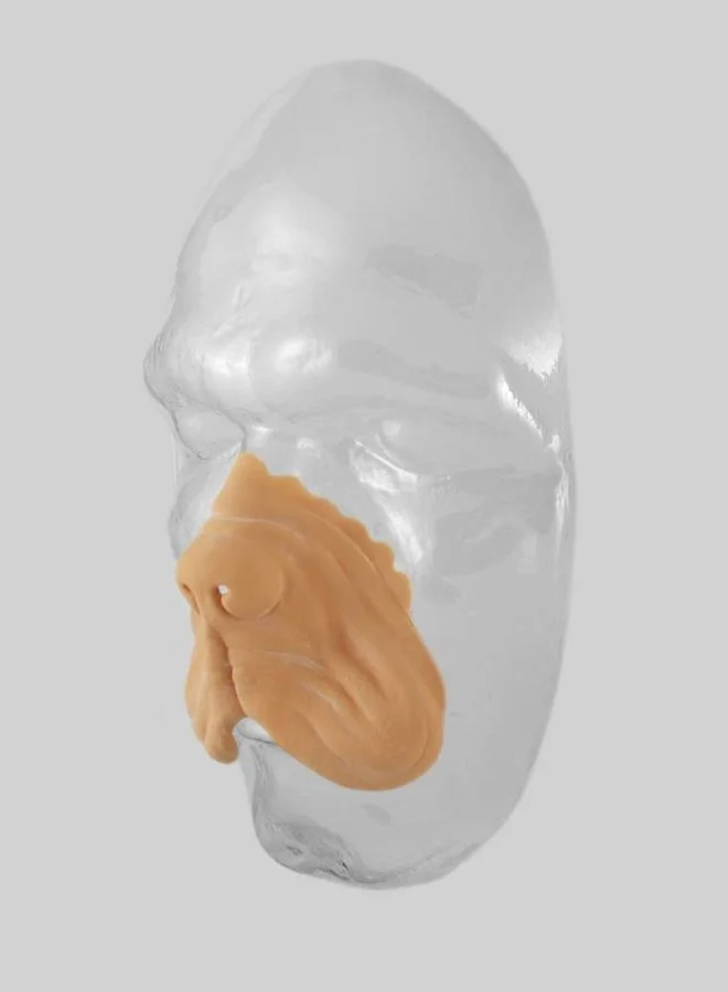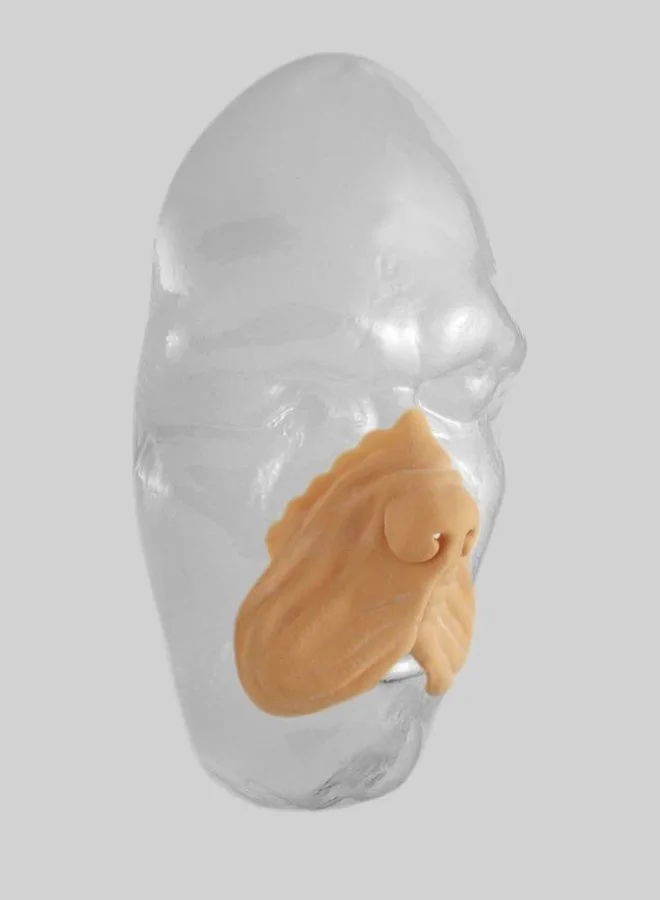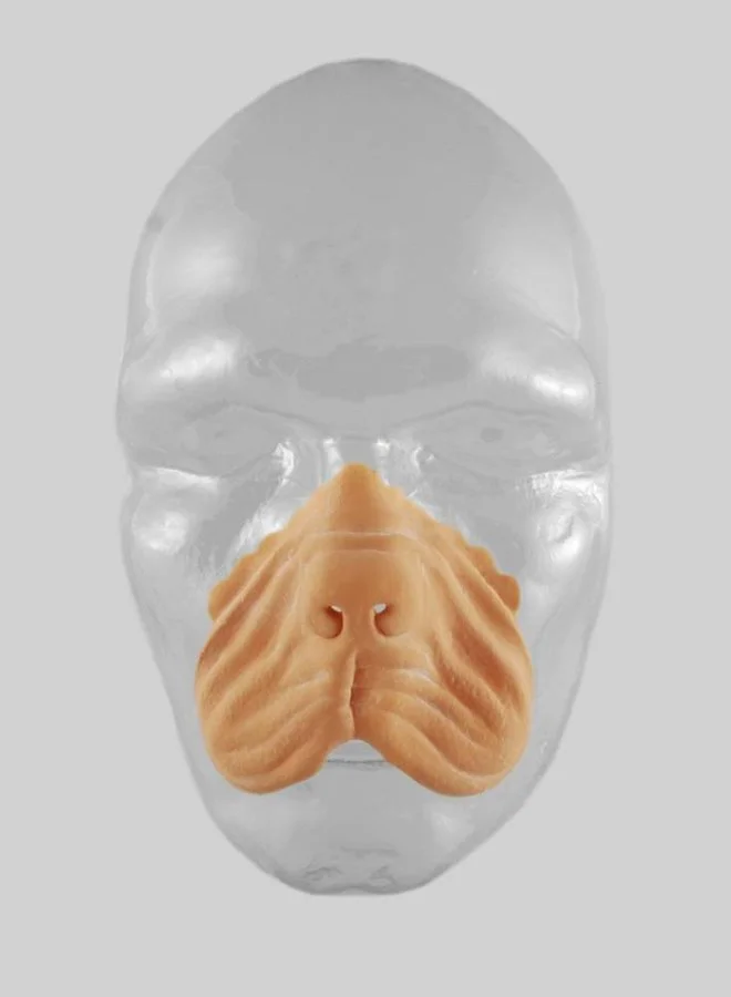 Neem de neus of set uit het doosje en plaats het op de huid om inzicht te krijgen of de randen goed aansluiten en waar het straks wordt vastgelijmd. Ontvet de huid met alcohol en gebruik vervolgens Mastix-P om de neus te bevestigen.