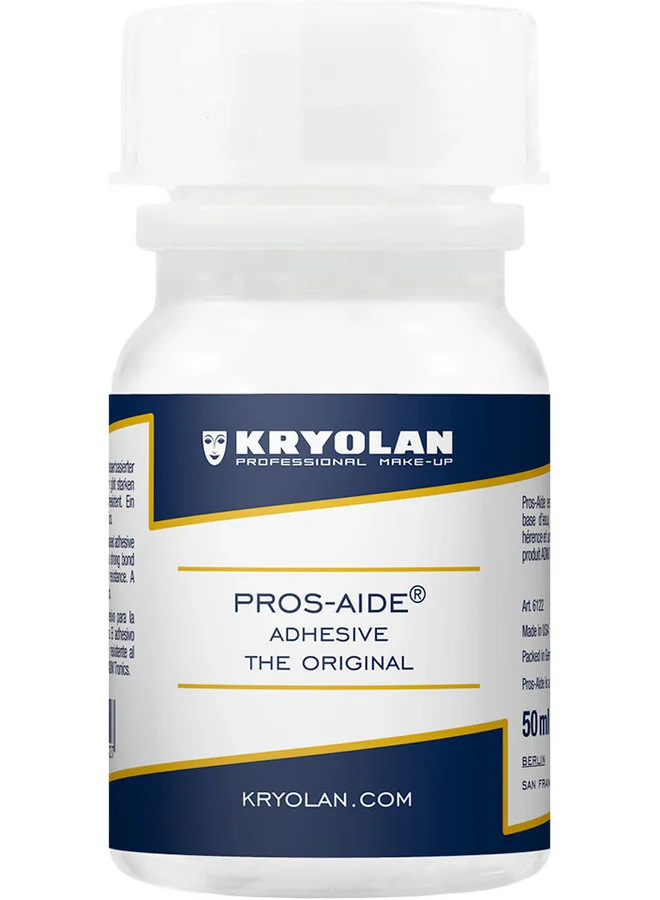 PROS-AIDE adhesive is een kleefmiddel voor special f/x. De lijm is uitzonderlijk sterk en kan gebruikt worden om foam appliances en andere 3D-delen mee te lijmen. Ook perfect om overgangen mee weg te werken. Gebruik wattenstaafjes om PROS-AIDE adhesive op de huid en het te lijmen deel aan te brengen. Laat even drogen en druk het voorwerp dan op de huid. Indien gewenst kun je de randjes iets optillen om meer lijm aan te brengen. Om de randjes weg te werken gebruik je een klein latexsponsje om PROS-AIDE adhesive over de randjes te stempelen. Poeder tenslotte af.